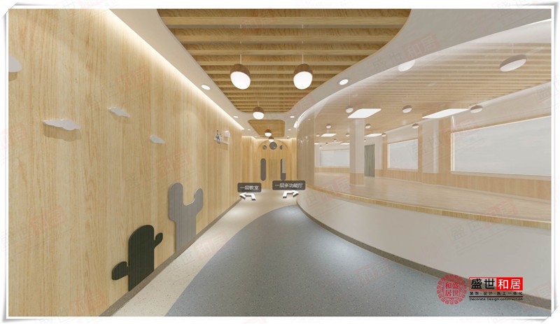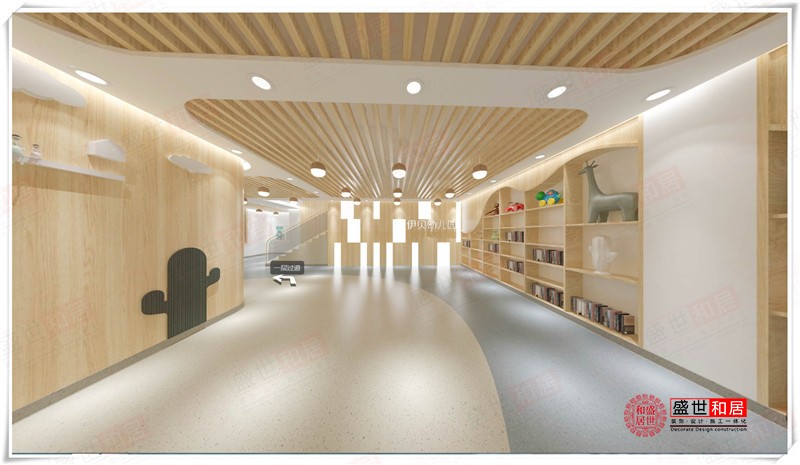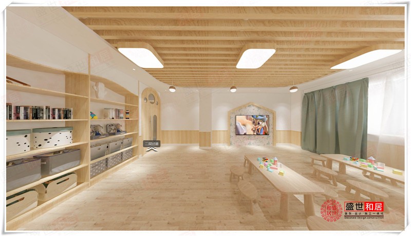 本案為安徽盛世和居裝飾承接的伊貝幼兒園裝修項目的設(shè)計效果圖。合肥幼兒園裝修公司的設(shè)計師在用色上,基本使用了白色及原木色兩種色調(diào)。白色是萬能搭配色,而原木色調(diào)的材質(zhì)能給幼兒園一種接近大自然的感覺。因為原木色取之于木材,其紋理的美感以及木材本身散發(fā)出木質(zhì)的特有香氣都能讓人感覺溫馨舒適。